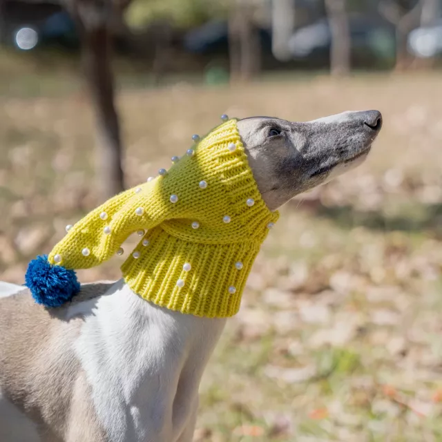 Whether you have a dainty Italian Greyhound, a graceful Whippet, or a majestic Greyhound, this hat has been thoughtfully sized to suit them all. Available in Small (for Italian Greyhounds and small dogs), Medium (for Whippets and similar breeds), and Large (for Greyhounds and larger dogs), it ensures a snug yet comfortable fit. Each piece is handmade from soft wool, offering natural warmth and breathability during chilly weather.